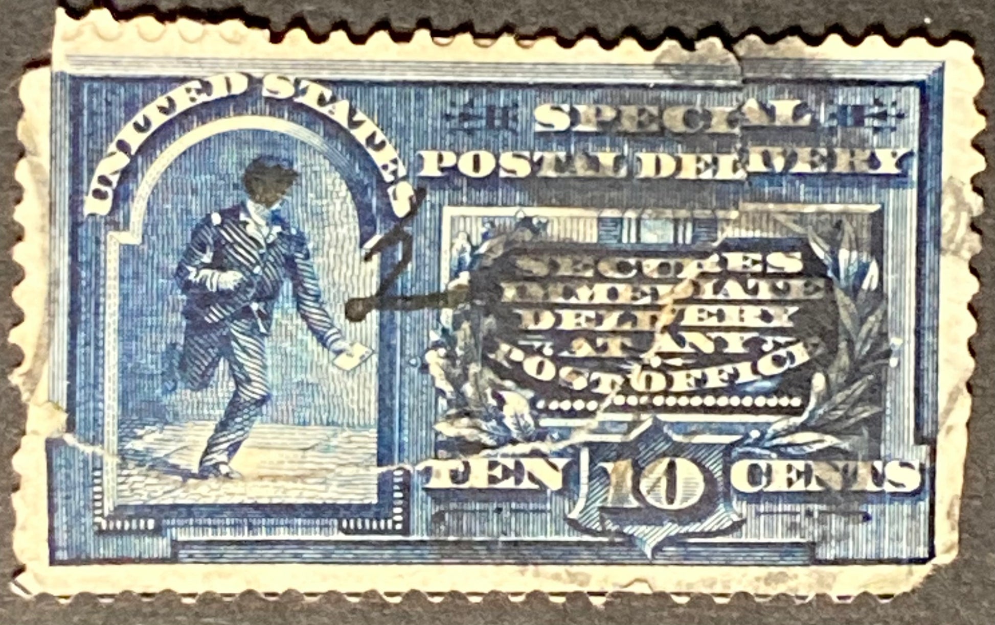 The 10 cents blue Special Delivery Stamp is a postage stamp issued by the United States Postal Service. It was designed for immediate delivery of mail and featured a blue color scheme. The stamp depicts an image of a messenger running with a letter in hand, symbolizing the speed and urgency of the special delivery service. The words "Special Delivery" and "10 cents" are prominently displayed on the stamp, along with the phrase "Secures immediate delivery at any Post Office." This stamp was used by individuals who needed to guarantee that a letter or package would be delivered as quickly as possible and allowed for the recipient to receive their mail the same day it was sent.