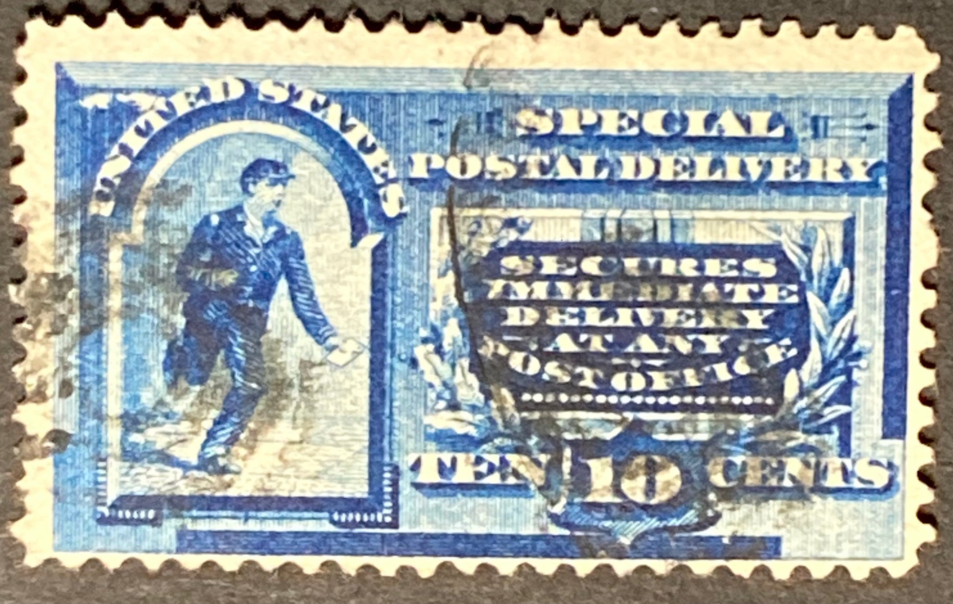 The 10 cents blue Special Delivery Stamp is a postage stamp issued by the United States Postal Service. It was designed for immediate delivery of mail and featured a blue color scheme. The stamp depicts an image of a messenger running with a letter in hand, symbolizing the speed and urgency of the special delivery service. The words "Special Delivery" and "10 cents" are prominently displayed on the stamp, along with the phrase "Secures immediate delivery at any Post Office." This stamp was used by individuals who needed to guarantee that a letter or package would be delivered as quickly as possible and allowed for the recipient to receive their mail the same day it was sent.
