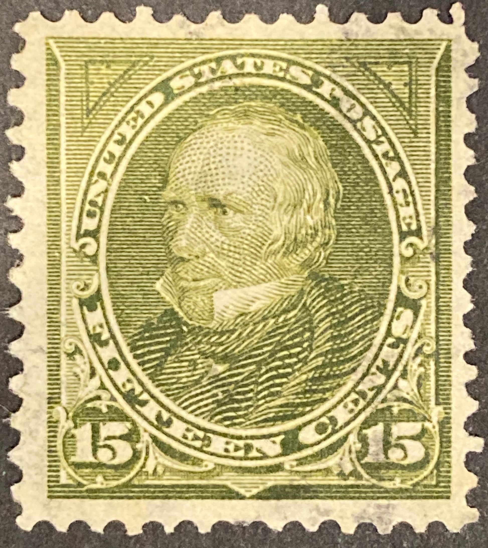 the 1898 Scott #284 stamp features a portrait of Henry Clay, a famous American statesman and orator. The stamp design is very similar to the Benjamin Franklin stamp, with Clay's portrait facing to the right and the words "UNITED STATES POSTAGE" at the top and "TWO CENTS" at the bottom. The olive green color of the stamp is achieved through a combination of blue and yellow inks, giving it a unique and distinct appearance. Like the Franklin stamp, the Scott #284 Clay stamp was used primarily for domestic first-class mail and is a popular collector's item today.