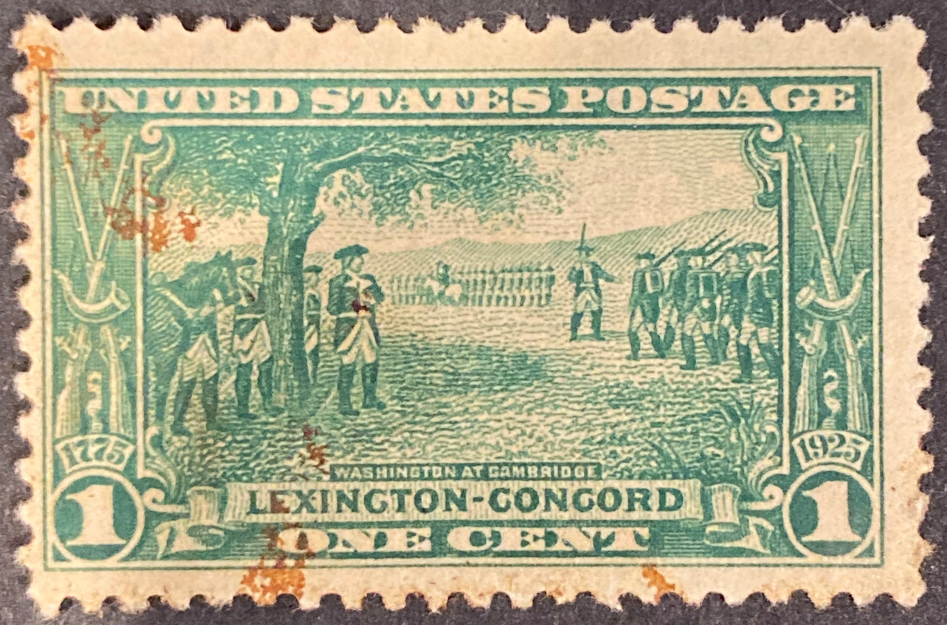 The 1925 1 cent Washington at Cambridge Lexington-Concord Stamp is a postage stamp that was issued by the United States Postal Service on April 19, 1925, to commemorate the 150th anniversary of the battles of Lexington and Concord, which marked the beginning of the American Revolutionary War.