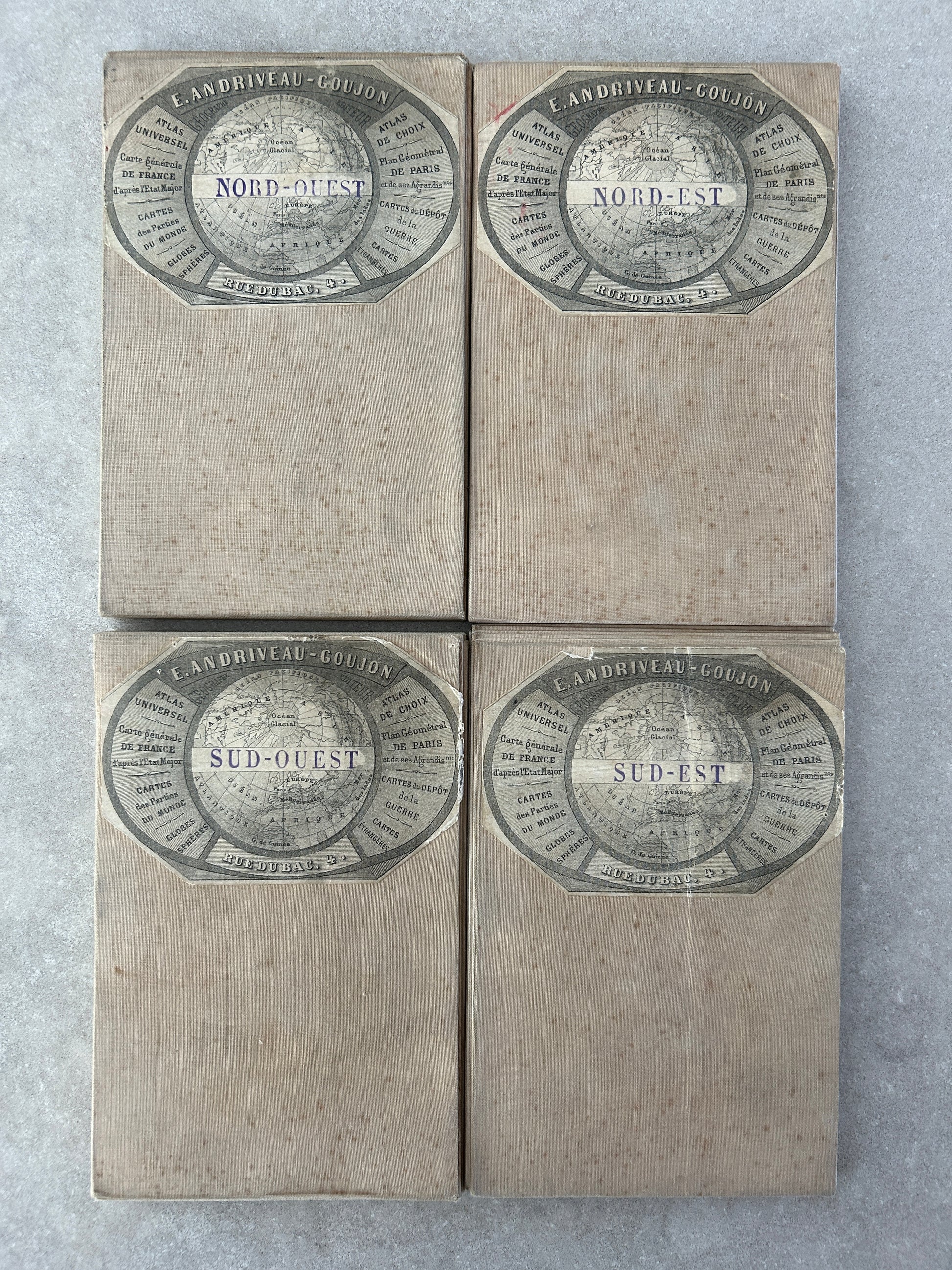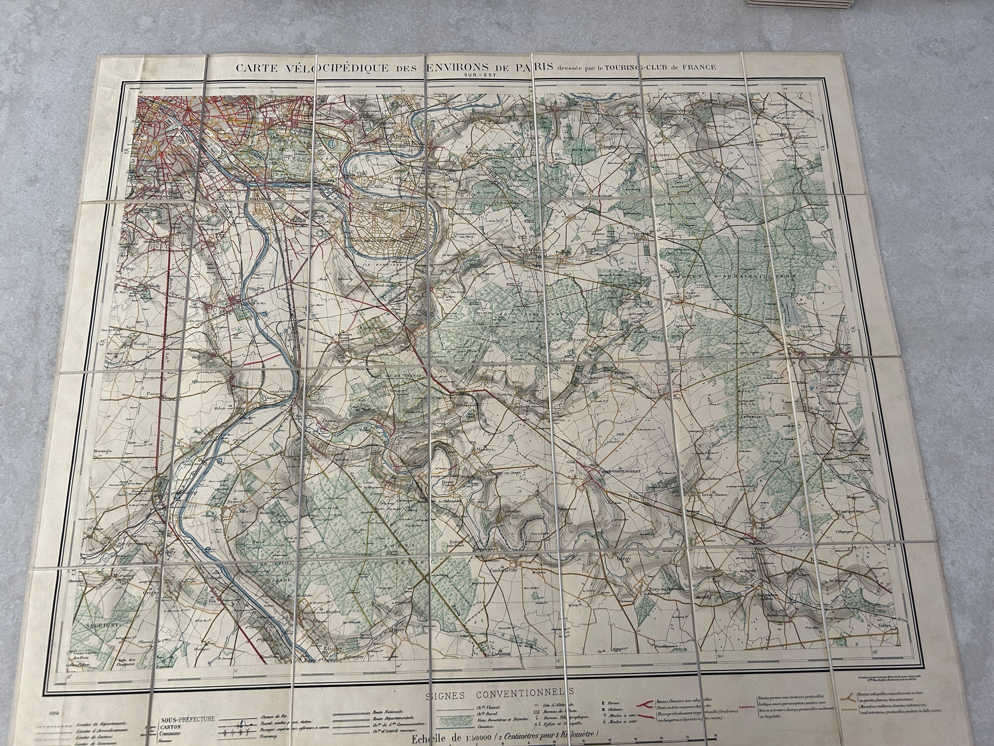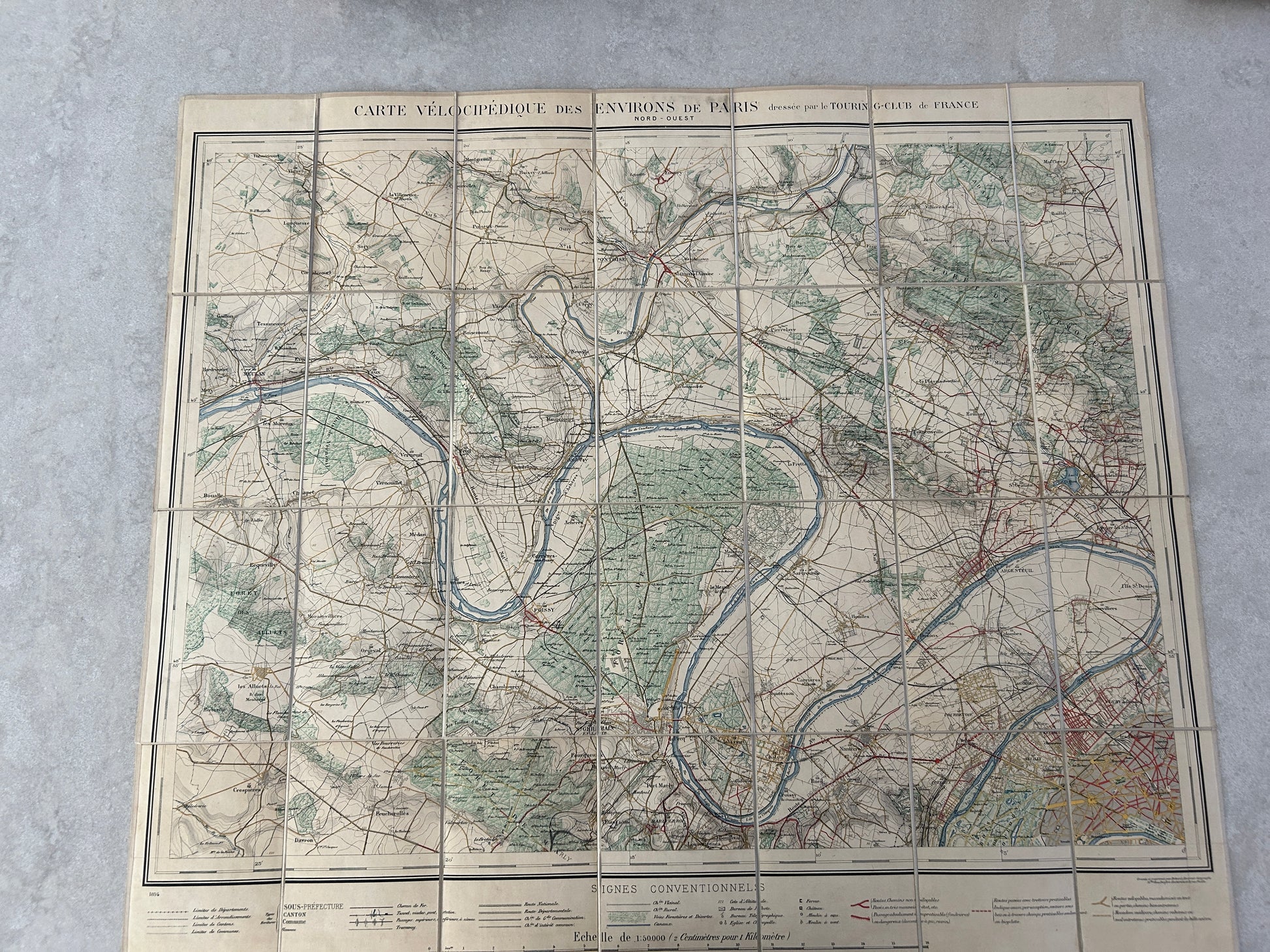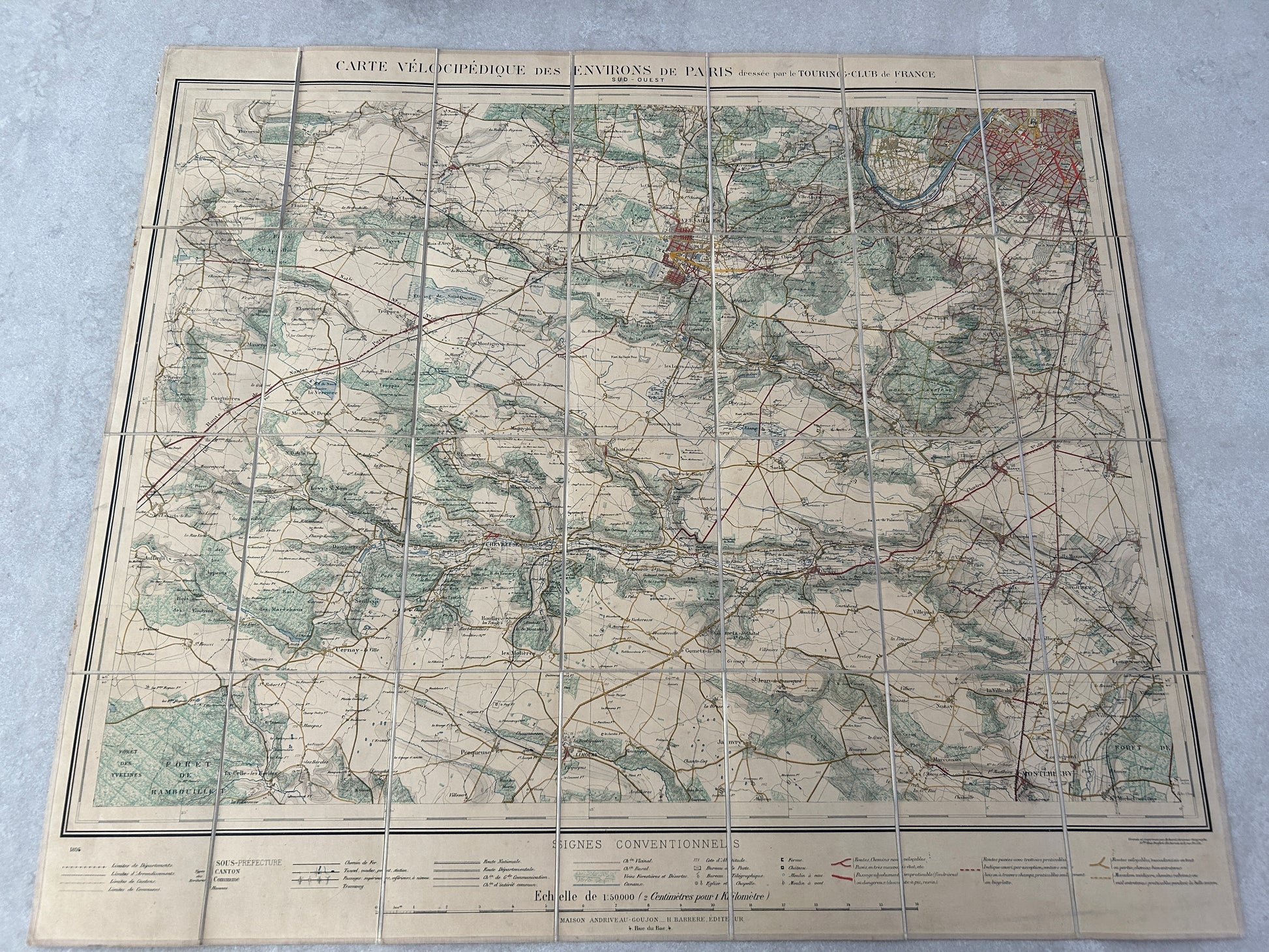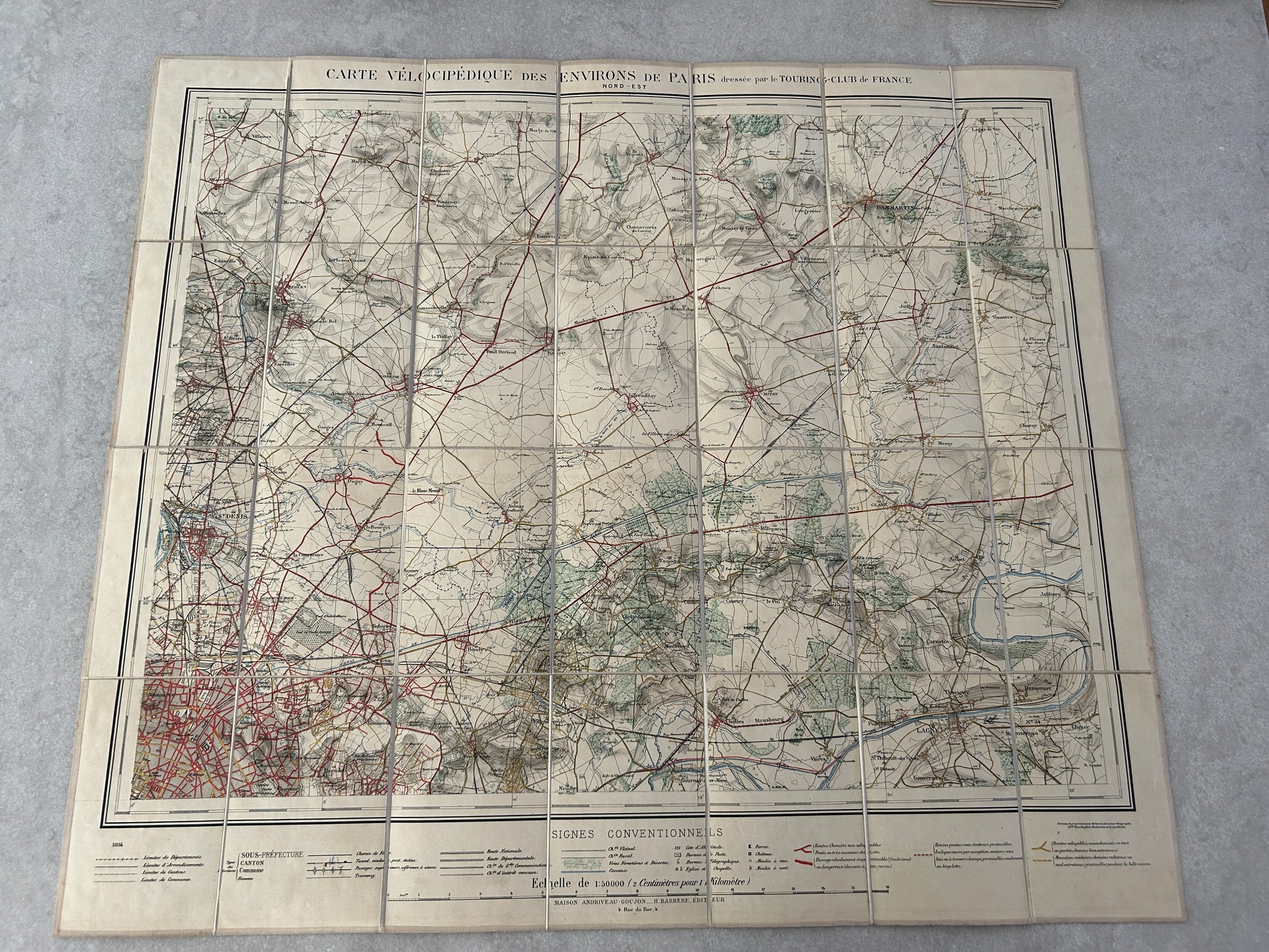 Carte vélocipédique des environs de Paris, Paris, Andriveau-Goujon, 1894, set of 4 maps with tissu backing, put together by le Touring-Club de France, printed by Erhard, 148 x 129 cm