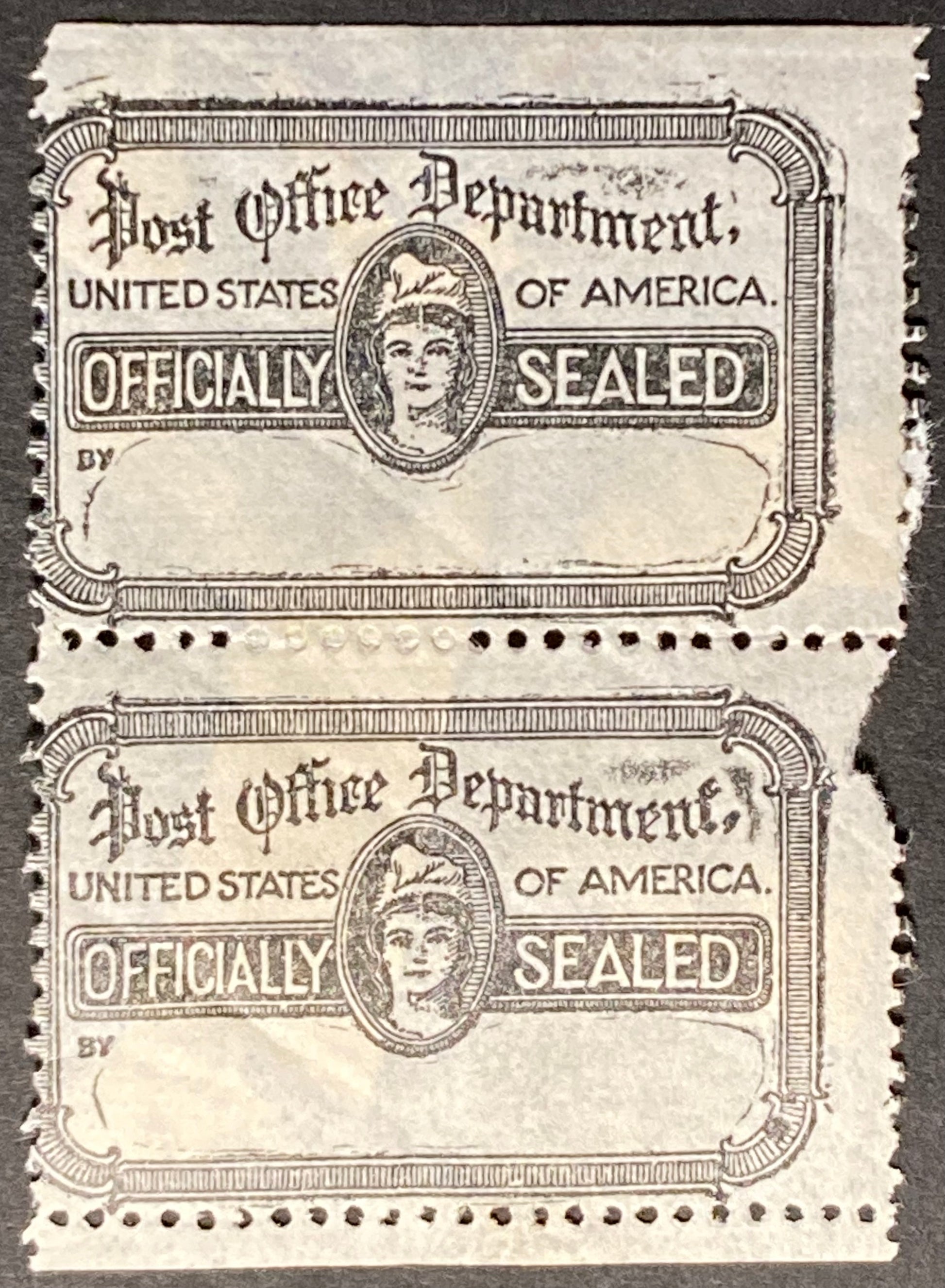 The officially sealed stamp from the Post Office Department of the United States of America is a small rectangular shaped adhesive label with a design that symbolizes the authority and authenticity of the U.S. Postal Service. The stamp features the official seal of the Post Office Department, typically in blue or black ink, and includes the words "Post Office Department" and "United States of America." The officially sealed stamp is used to secure mail, packages, and other postal items, ensuring that the contents remain confidential and protected during delivery.