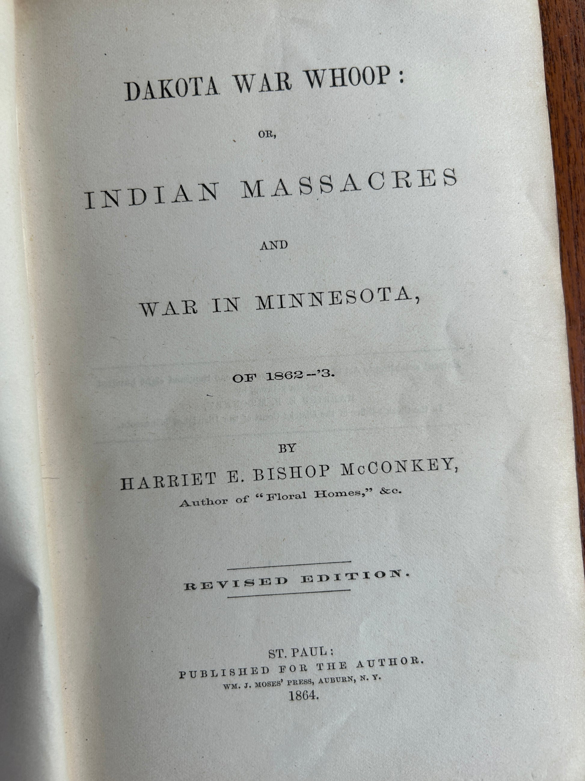 Title: Dakota War Whoop or, Indian Massacres and War in Minnesota, of 1862-'3 by Harriet E. Bishop McConkey